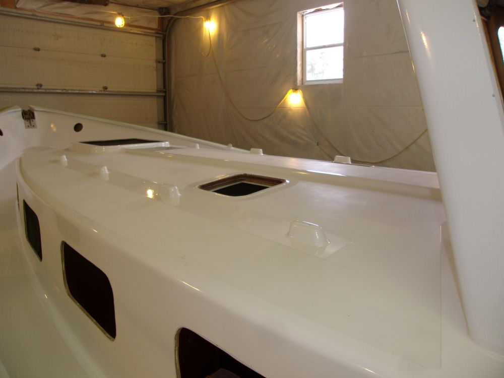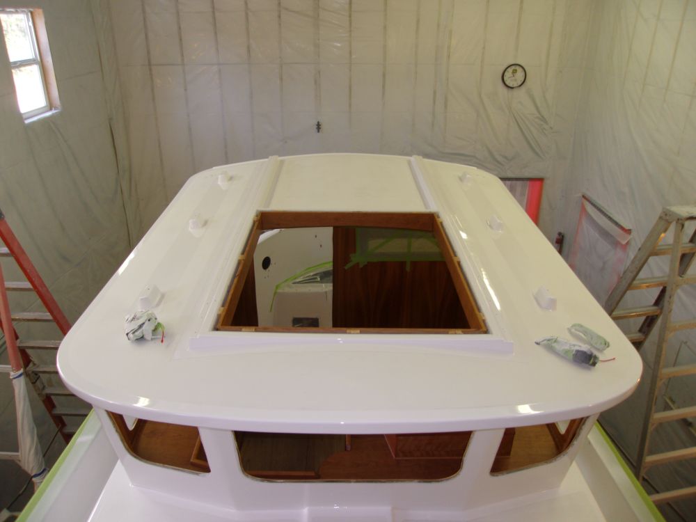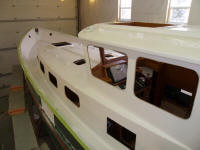 The fresh paint would need additional time to cure before I could press forward with the next tasks, so I spent several relaxed hours removing all the masking tape and so forth from the decks.  Someone did a very thorough job taping up all the ports and windows, and it took a while to remove all of this, and then clean up the litter.