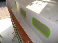 Earlier, I'd noticed a few small areas on deck that I'd marked long ago, areas with small chips, gouges, or sanding marks that required a bit more attention to prepare for paint.  With a trowelful of leftover fine fairing compound from another job, I filled these areas.  Once the masking was complete, I'd do one final light sanding all over the decks later to smooth out the fairing compound and generally clean up the decks.