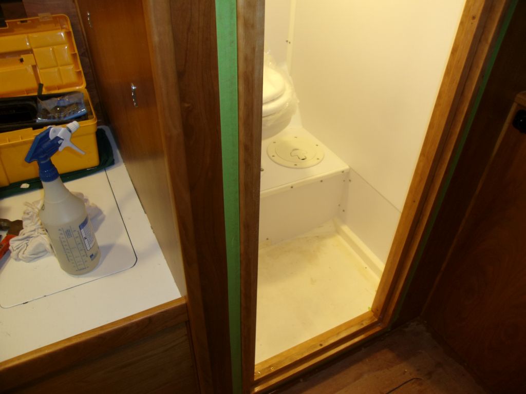 In what would become routine over the next week or so, I continued the varnish base buildup on the new head door and door trim.  I started with the back side (head side) of the door, and would complete its varnish before flipping it to do the passageway side.