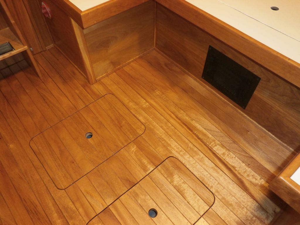 In a short work session, I cut and installed the baseboard trim to complete the cabin sole installation.  I began with a tape measure, and measured all the various pieces required.  Because of the configuration of existing trim (all the cabinetry corners already featured their  own trim pieces running down to the sole), there was no need for fancy cuts or miter joints--just simple straight cuts to fit the new trim in between as required.
